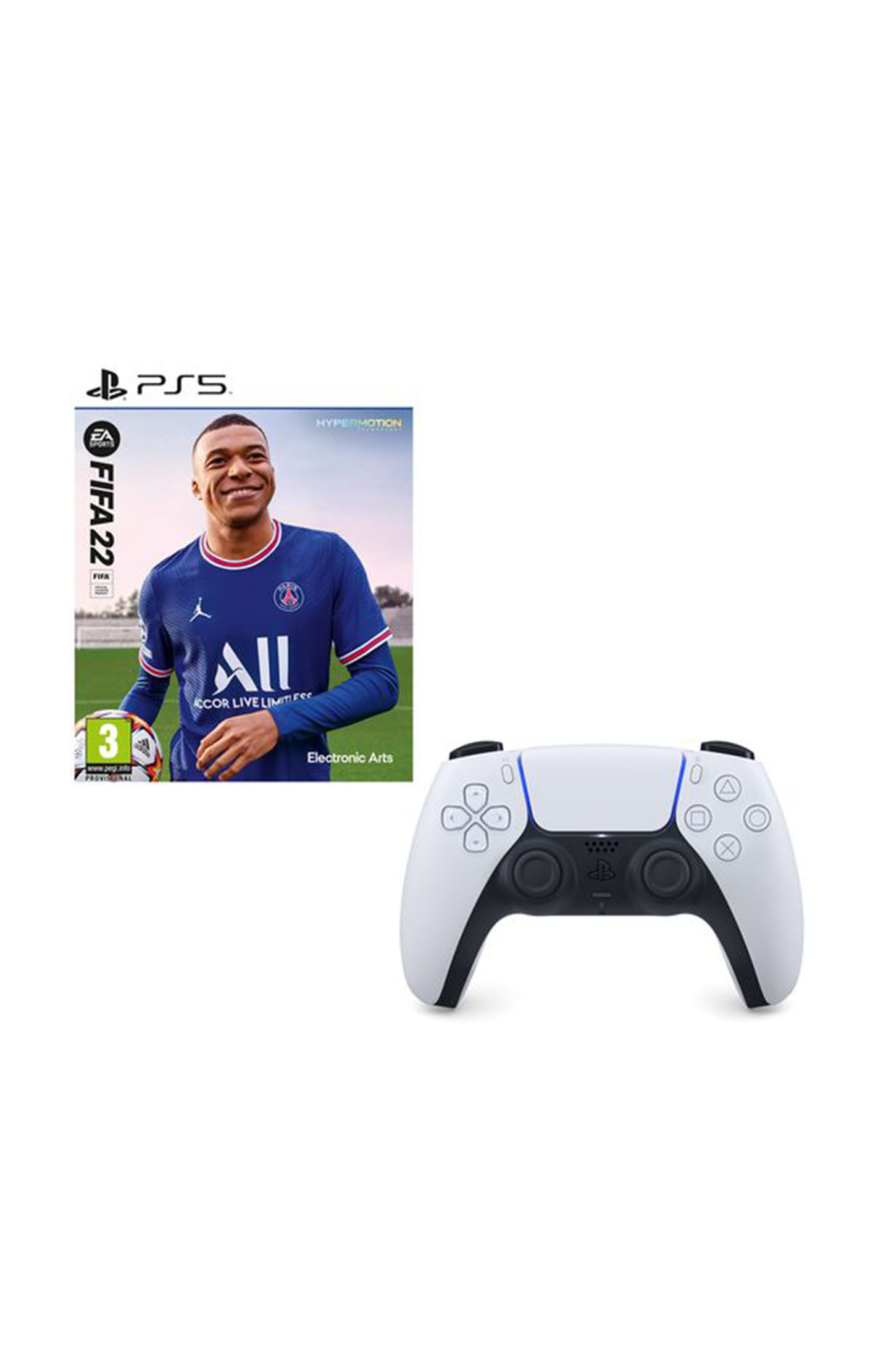Σετ το οποίο αποτελείται από το FIFA 22 PS5 Game και από το ασύρματο χειριστήριο Sony DualSense για το PS5.