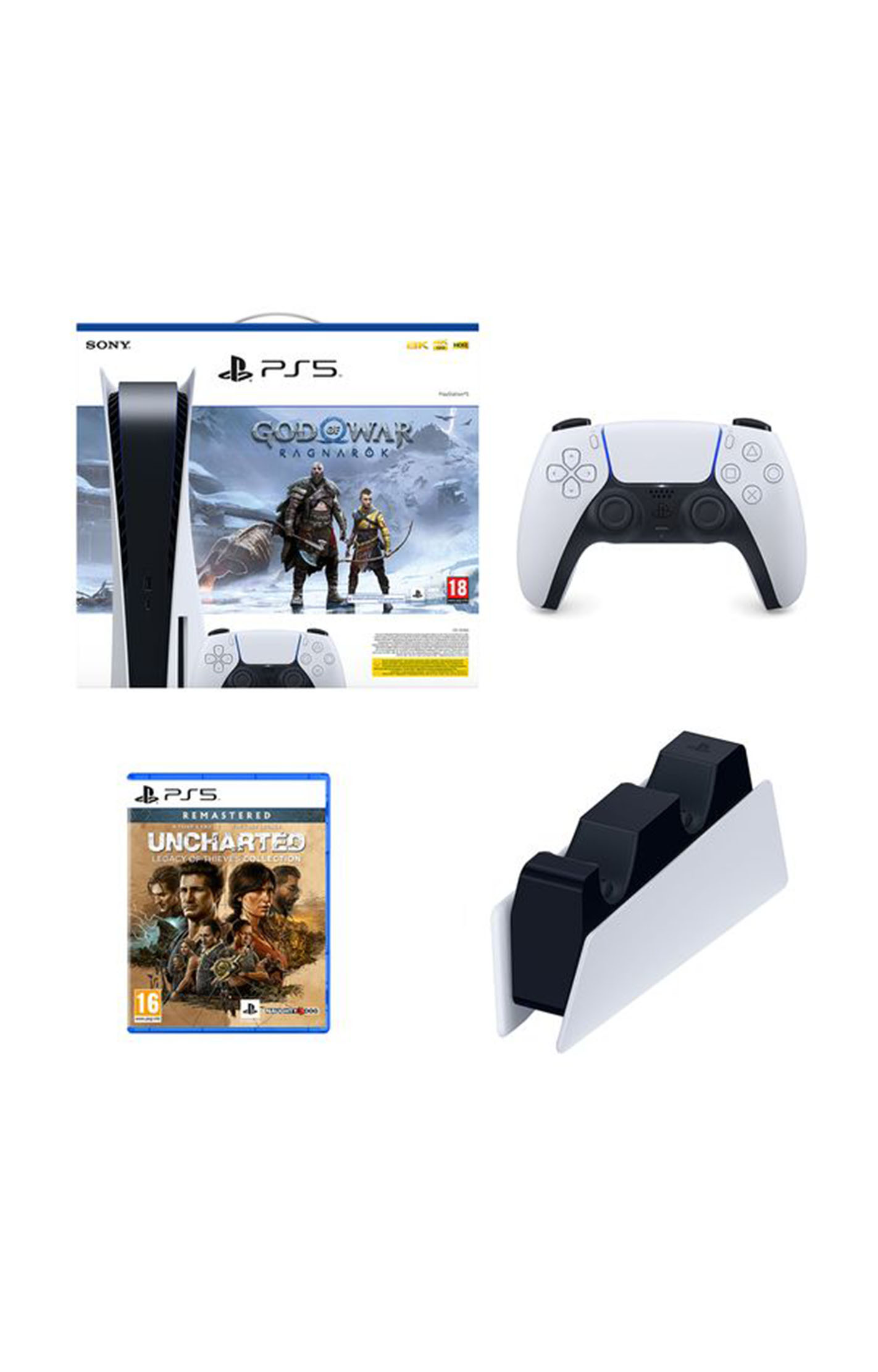 Σετ το οποίο αποτελείται από την κονσόλα Playstation 5, το παιχνίδι God of War Ragnarök σε Voucher Code, το παιχνίδι Uncharted: Legacy of Thieves Collection, το χειριστήριο Sony DualSense Wireless Controller και την βάση φόρτισης Sony charging Station For DualSense PS5